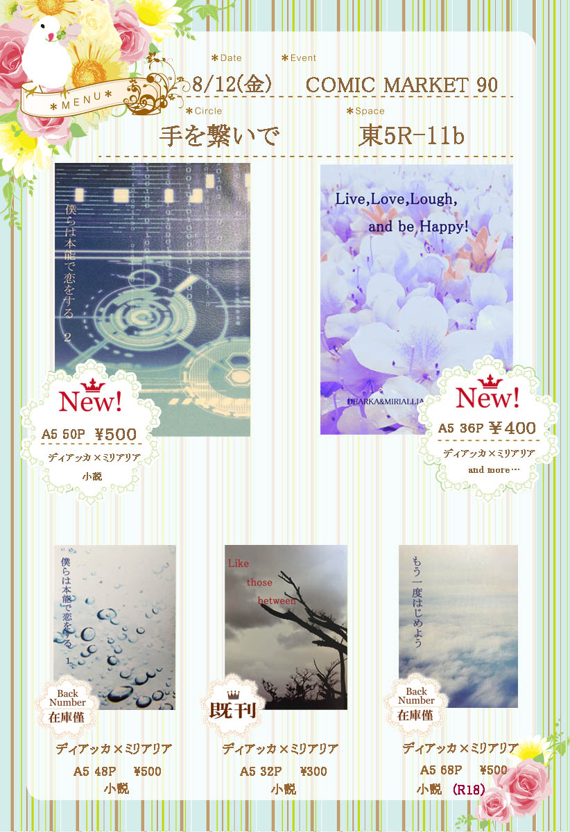 8月 12 2016 数時間後に旅立ちます Posted on 2016/08/12 by 菫 とか言いつつ、中途半端に用意できてなかったり見つからないものがあって いろいろ難航しているのですが;; C90、参加して参ります! 改めてお品書きとアンソロ告知ブログ(訂正と注意書きを載せております)等 アップいたしますので、どうぞご覧ください(●´艸`) なお、「もう一度はじめよう」は在庫残り一冊となっております;; 明日も暑そうです。 私自身もそうですが、ご来場の予定がある皆様、熱中症対策は万全になさって下さいね! いつも拍手をありがとうございます!